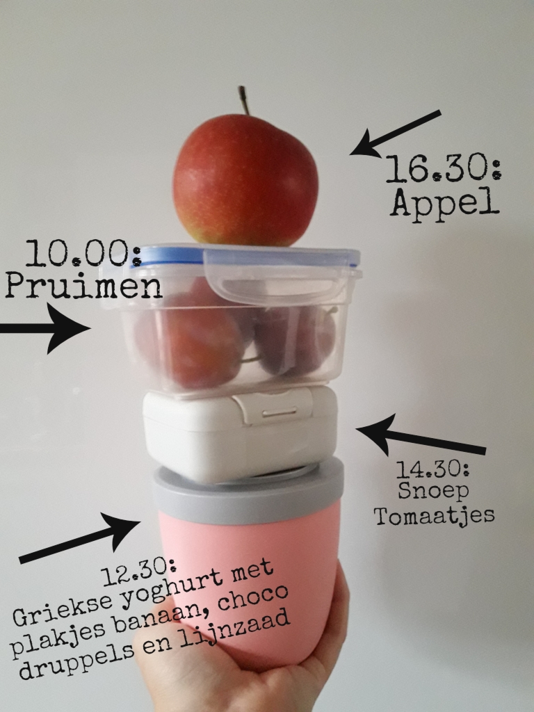 Mijn werkdagen verschillen van dagen tot 12.30, tot 15.00 of 17.00...dat verschilt nogal. Op de dagen dat ik tot 12.30 werk, eet ik thuis. Hieronder kan je zien wat ik ongeveer op een werkdag eet...